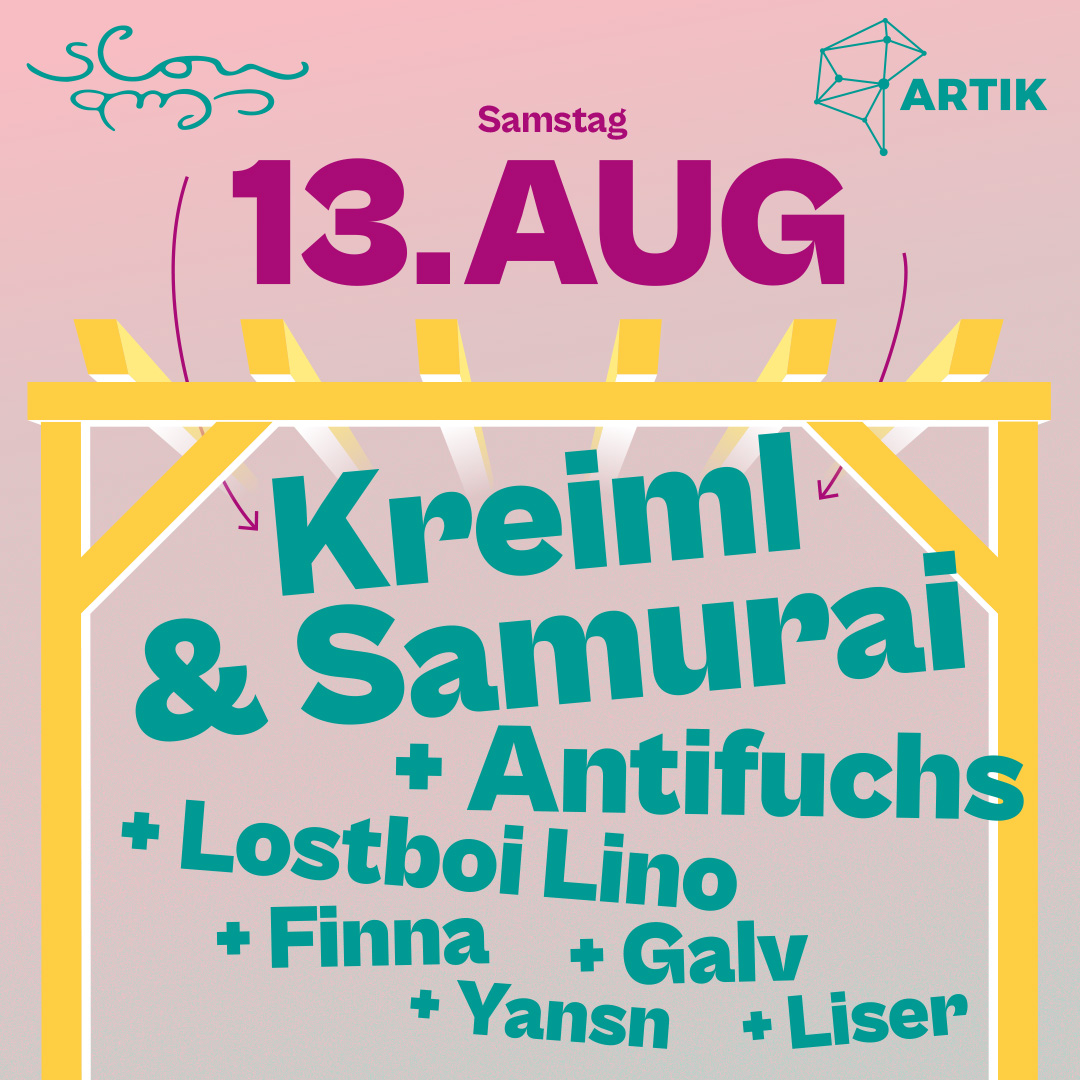 Am Samstag, den 13.08., glitzert und leuchtet das Line Up des PERGOLA Open Air in allen erdenklichen Farben – und das vor allem für alle Liebhaber*innen des deutschsprachigen Raps. Für alle denen klare politische Statements, laute Stimmen und queer-feminstischer Support besonders am Herzen liegt, haben wir hochqualitative Künstler*innen am Start, die von 15:30 bis 22:00 Uhr live und open air so richtig abliefern. Wir freuen uns riesig KREIML & SAMURAI, ANTIFUCHS, FINNA, LOSTBOI LINO, GALV, LISER und YANSN auf unseren zwei Bühnen begrüßen zu dürfen und mit euch zu feiern!