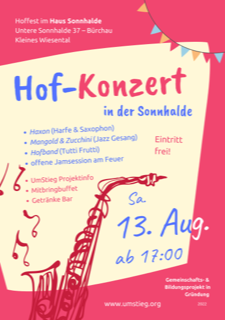 Es spielen für euch das Jazzduo Haxon (Harfe & Saxophon) und unsere musikalisch bunte Hofband Tuttifrutti.