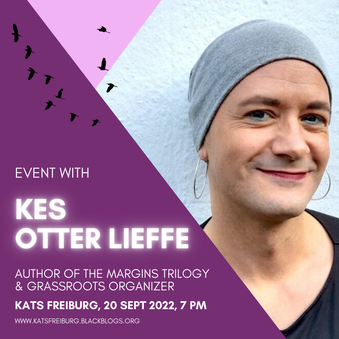 We are very happy to announce that author, facilitator and community organiser Kes Otter Lieffe is coming to Freiburg on the 20th of September @KaTS Freiburg! Kes is a working class, chronically ill, femme, trans woman - and a grassroots community organiser already for over twenty years. Kes will read from Margins, her trilogy of queer and trans speculative fiction novels. In this futuristic story, marginalised characters take centre stage in powerful resistance movements.