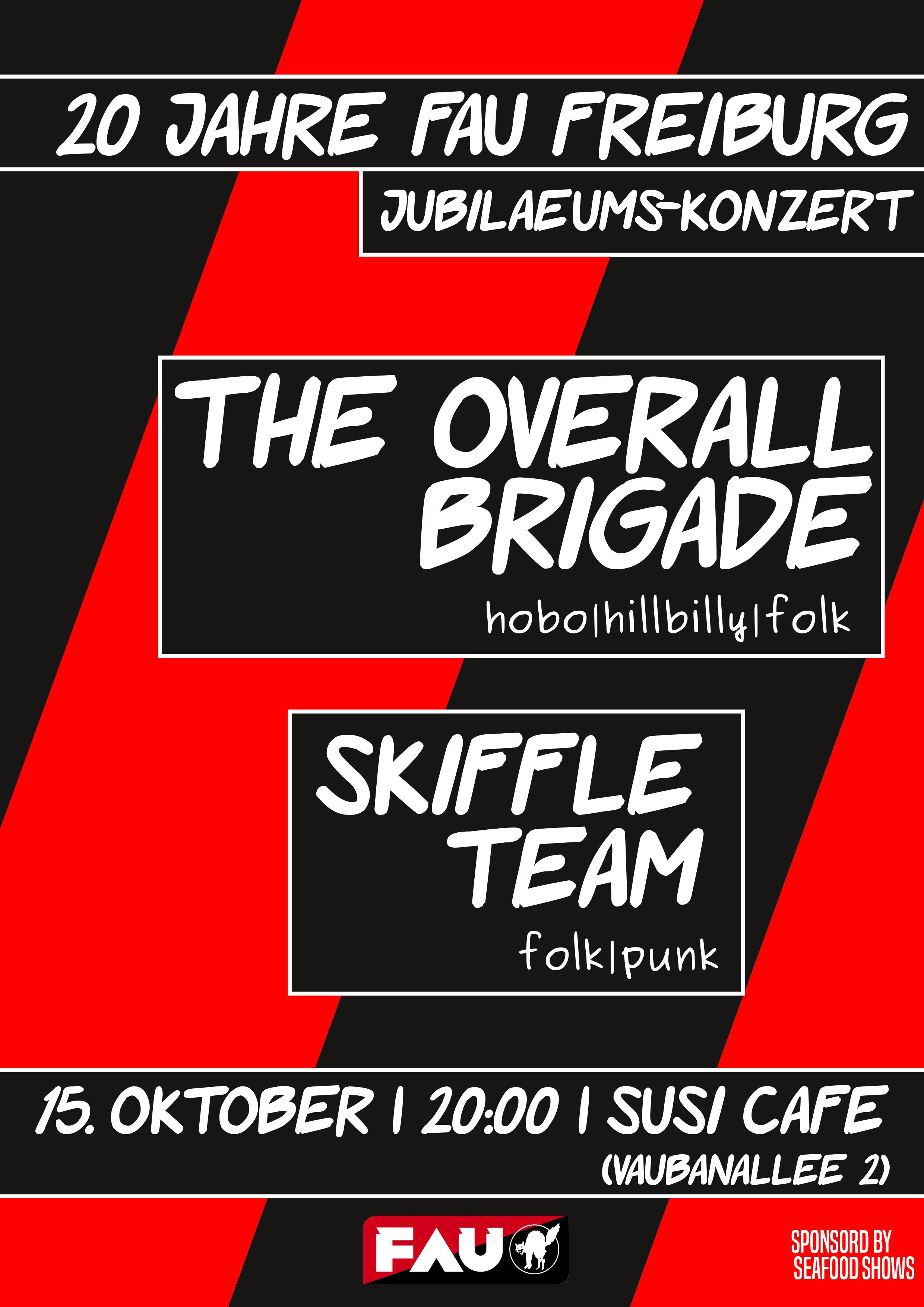 Vor gut 20 Jahren wurde die FAU Freiburg gegründet. Auslöser waren die Hartz-Gesetze, die Ausweitung prekärer Arbeitsverhältnisse, insbesondere die Ausweitung der Leiharbeit, sowie eine generelle Enttäuschung über die Politik der DGB Gewerkschaften. In den letzten Jahren konnte das Syndikat Freiburg einen kontinuierlichen Mitgliederzuwach verzeichnen und immer wieder kleine Erfolge erringen. Um unser 20 jähriges Jubiläum zu feiern, besucht uns die Band „The Overall Brigade“ aus Köln für ein Konzert. Kommt vorbei und feiert mit uns! Und werdet Mitglied ;)