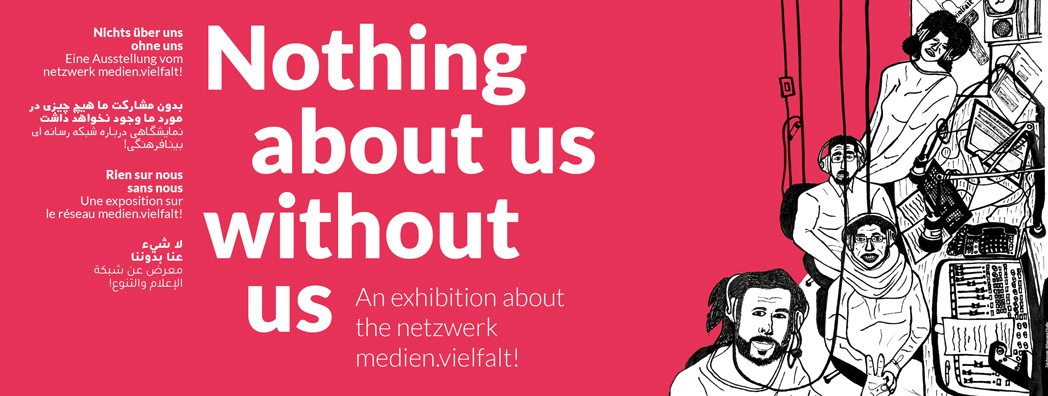 Mit der Ausstellung „nothing about us without us“ geben Medienmacher\*innen und Radioredaktionen mit Flucht-oder Migrationserfahrung des Netzwerks netzwerk.medienvielfalt Einblicke in ihre Arbeit im Freien Radio, aber auch als Podcaster\*innen oder als Social Media Aktivist\*innen. Die Ausstellung geht zu dem der Frage nach, wie Berichterstattung, journalistische (Nicht-)Vielfalt und mediale Repräsentation zusammenhängen und welche Ideen und Bedarfe es ganz praktisch gibt, um an den bestehenden Verhältnissen etwas zu ändern.