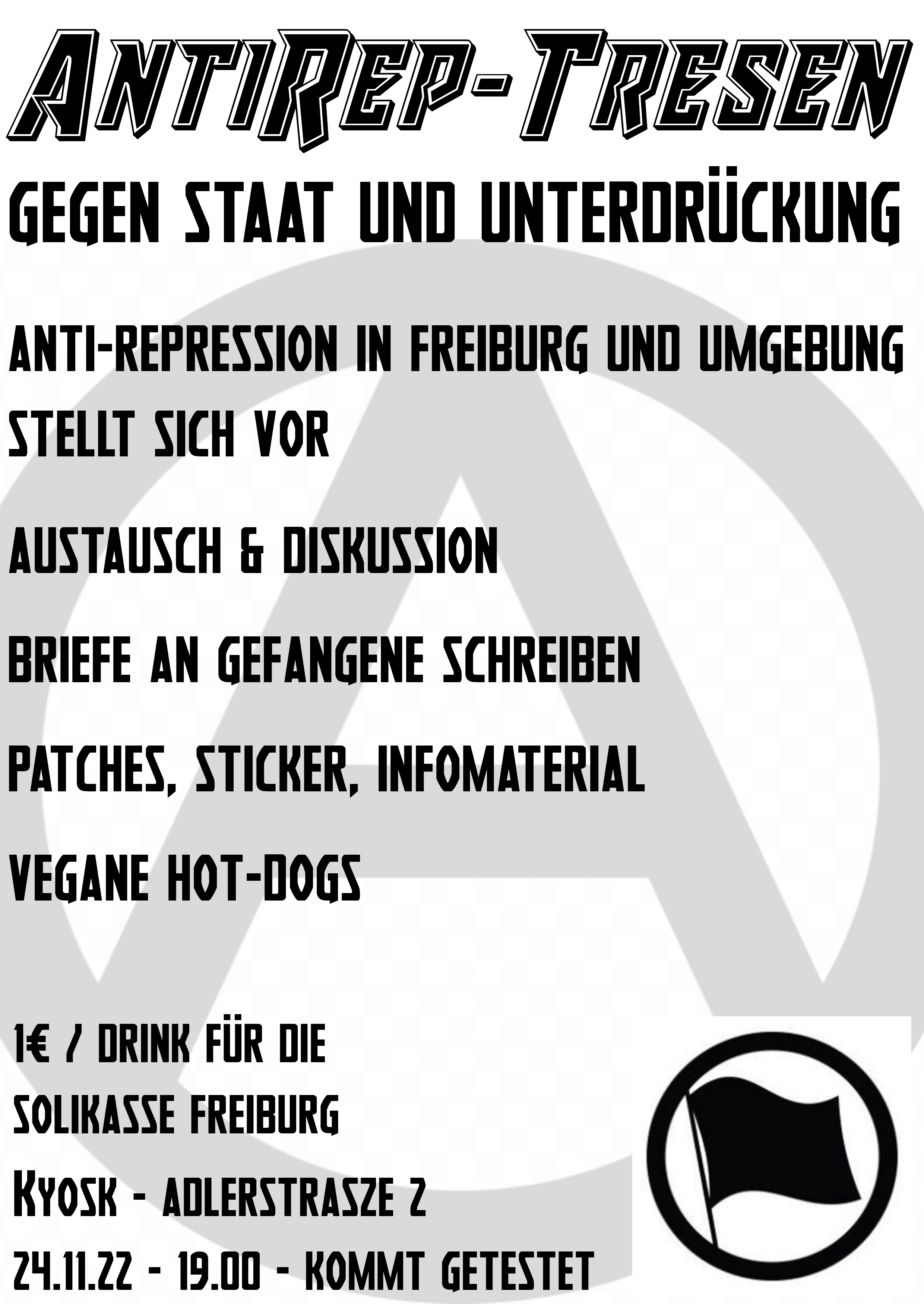 Wir laden ein zum Anti'Rep-Tresen im November. Auch im beschaulichen Freiburg bekommen Menschen Strafbefehle, müssen Geldstrafen wegen Ordnungswidrigkeiten bezahlen oder wandern in den Knast, weil sie gegen die "gegen die Regeln" verstoßen haben. Wenn Repression droht, könnt ihr die Rote Hilfe Freiburg oder den Ermittlungsausschuss Freiburg um Rat und Unterstützung bitten. Diese Unterstützung ist Teil politischer Arbeit und wird kostenlos angeboten. Wer kennt sich schon aus mit allen Gesetzen dieses Staates?