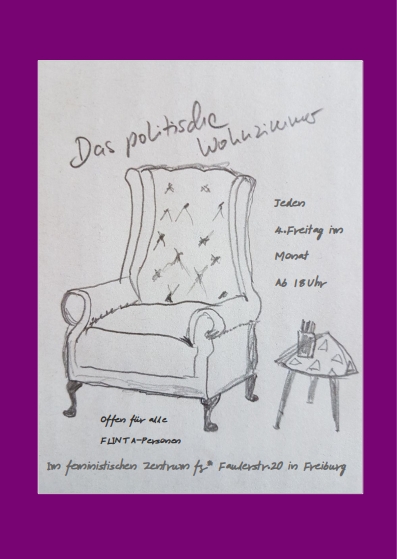 Was ist das politische Wohnzimmer? Ein Mal im Monat öffnen wir im fz* das politische Wohnzimmer für Vorträge, Lesungen, Filme, Konzerte uvm. Zwischen Inputs, Austausch und zusammen rumhängen haben wir Lust politische Themen gemeinsam anzugehen und einander kennenzulernen. Dabei gibt es zwischen den Ohrensesseln Raum für engagierte Gespräche, Gemütlichkeit, Snacks und auch versacken ?