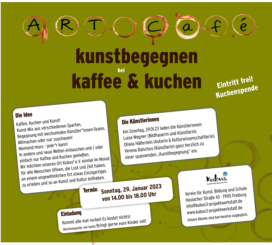 Die Idee, unterschiedliche Menschen an einen dritten Ort* zu „locken“, ihnen und uns die Möglichkeit zu bieten, in Kontakt mit Künstler*innen, verschiedenen Kunstsparten, Kunstwelten und anderen Menschen zu kommen, ging bisher voll auf. Am 29.1.23 von 14 bis 18 Uhr ist es wieder so weit. Beim 1. ArtCafé im neuen Jahr werden die drei Künstlerinnen: Verena Balschus (Künstlerin / Drucktechnik) , Luise Wegner (Bildhauerin) und Oliwia Hälterlein (Kulturwissenschaftlerin und Autorin) anwesend sein und die Möglichkeit bieten, sich in ein kreatives Setting einzubringen und dieses mitzugestalten. Wie immer findet auch dieses ArtCafé in ungezwungener Kaffee- und Kuchenatmosphäre statt.