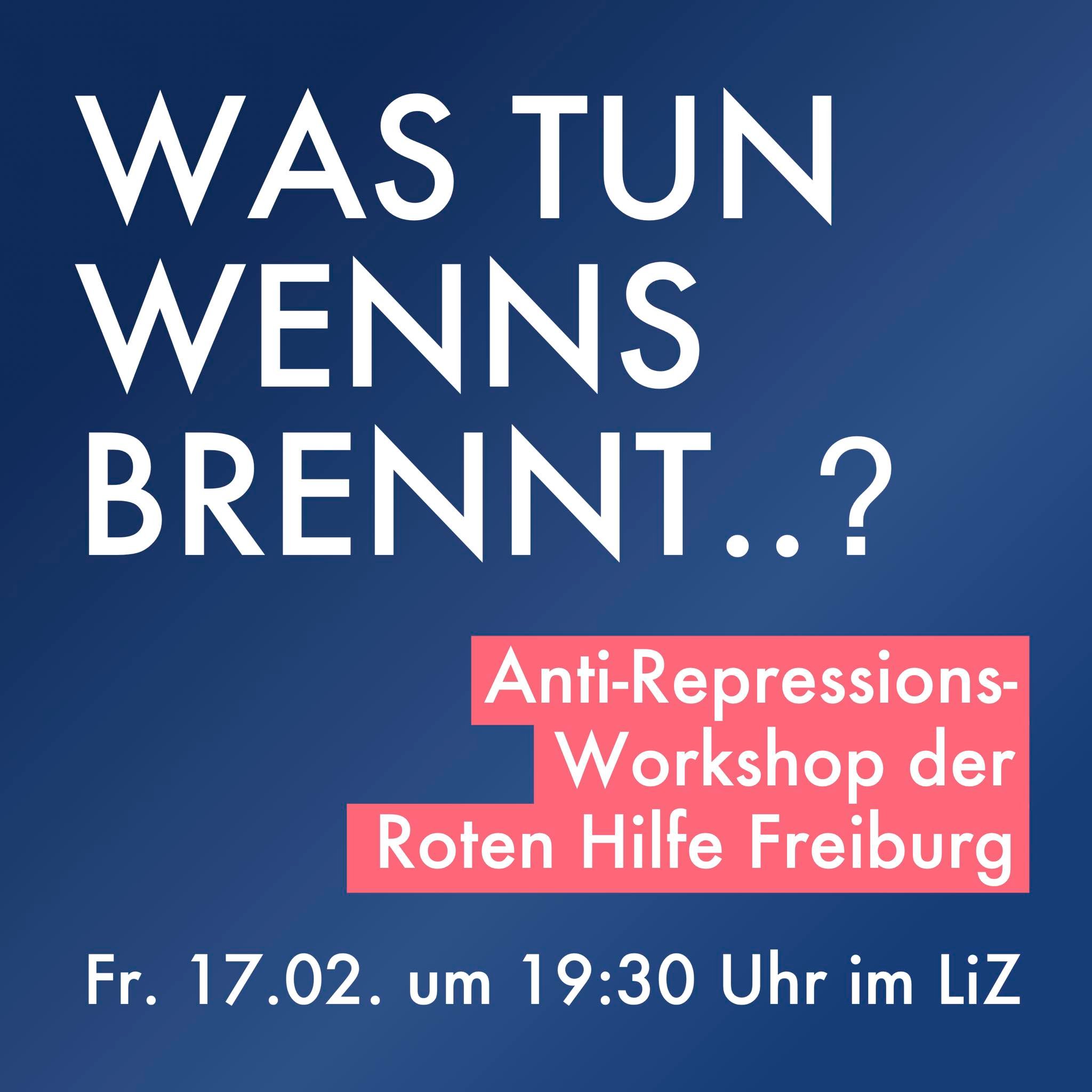 Deshalb haben wir die Rote Hilfe Freiburg eingeladen, die einen Antirepressionsworkshop für uns verantstaltet. Dort wird es darum gehen, wie ihr euch auf einer Demo verhaltet, wie ihr euch vor Repression schützen könnt und was im schlimmsten Fall passieren kann. Auch denjenigen von euch, die bereits Erfahrung auf Demonstrationen gesammelt haben, empfehlen wir, dabei zu sein.