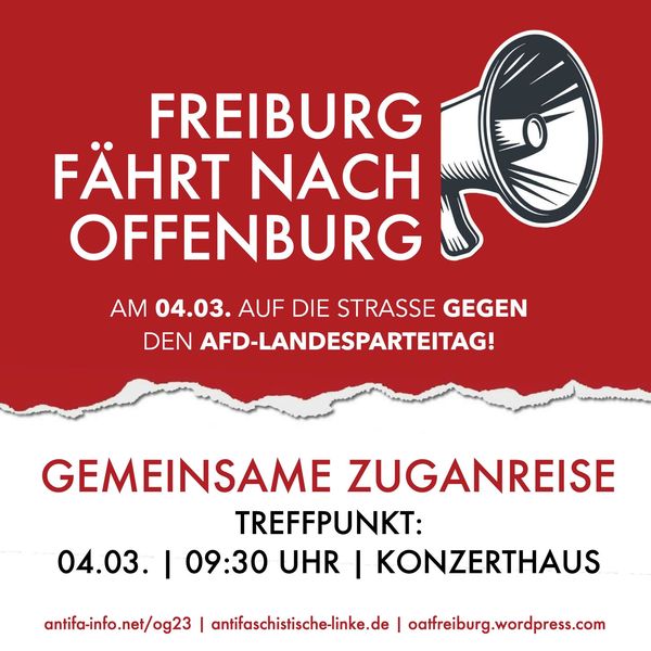 „Am 4./5. März 2023 will die AfD Baden-Württemberg in Offenburg ihren Parteitag abhalten. Mehrere hundert Rechte werden an diesem Wochenende auf dem Messegelände zusammenkommen und dort auch ihr 10jähriges Bestehen feiern.