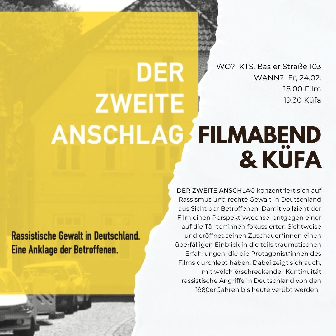 Am 24.02. laden wir in die Kats ein, um gemeinsam den Film "Der zweite Anschlag" anzuschauen. Der Film lässt die Überlebenden und Hinterbliebenen der Anschläge von Rostock-Lichtenhagen, Mölln und der NSU-Morde zu Wort kommen. Er kritisiert das inszinierte staatliche Gedenken, dass weder mit noch für die Betroffenen stattfindet. Er zeigt ihre Perspektiven und Gefühle und was sie unter Aufarbeitung und Gedenken verstehen. Wir würden dieser Kritik und den Perspektiven gerne einen Raum geben, um gemeinsam zu hinterfragen, wie wir gedenken, welche Positionen wir dabei haben/sehen und welche nicht.