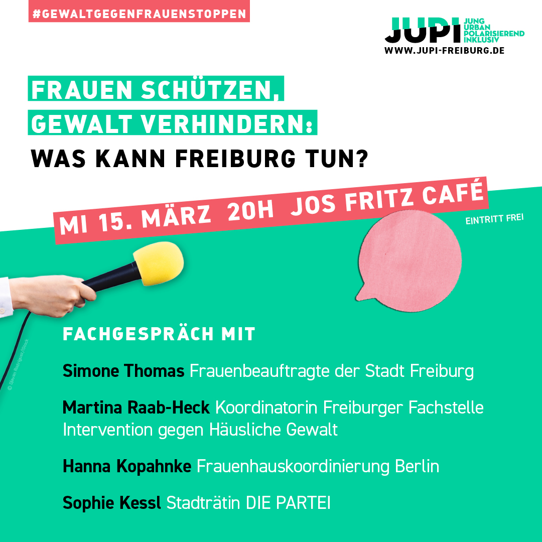 Am 15.03. um 20:15 Uhr veranstaltet die JUPI-Fraktion ein moderiertes Fachgespräch mit dem Titel „Frauen schützen, Gewalt verhindern: Was kann Freiburg tun?“ im Jos Fritz Café.