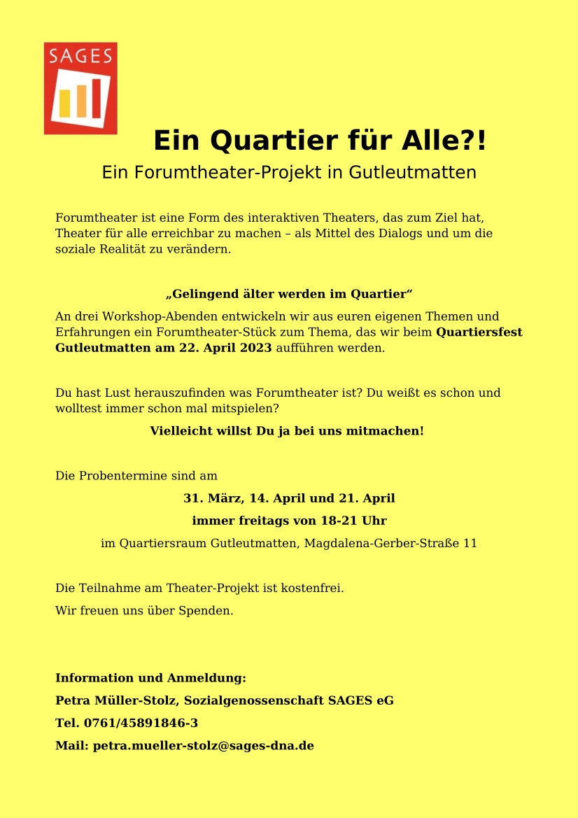 Ein Forumtheater-Projekt der Sozialgenossenschaft SAGES eG mit dem Forumtheater Freiburg ab dem 31.03.23 in Gutleutmatten