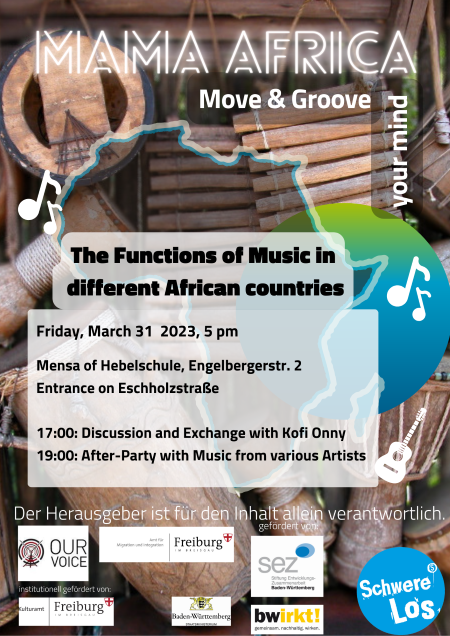 Am Freitag, 31.03., um 17 Uhr, berichtet der Musiker Kofi Onny aus Ghana gemeinsam mit Beuz Thiombane aus Senegal von der Bedeutung von Musik und Tanz in Afrika. Komm in die Mensa der Hebelschule, Eingang an der Eschholzstraße. Neben Podiumsdiskussion und Gespräch gibt es auch das westafrikanische Teeritual Ataya mit süßem afrikanischen Gebäck und später Perkussion und Tanz live!