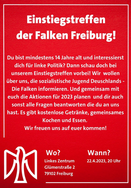 Du bist mindestens 14 Jahre alt und interessierst dich für linke Politik? Dann schau doch bei unserem Einstiegstreffen vorbei! Wir wollen über uns, die sozialistische Jugend Deutschlands - Die Falken informieren. Und gemeinsam mit euch die Aktionen für 2023 planen und dir auch sonst alle Fragen beantworten die du an uns hast.