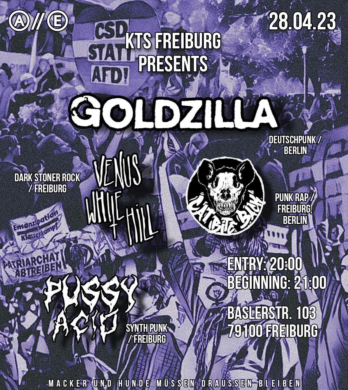 Am 28.04.23 begrüßen wir GOLDZILLA mit Deutschpunk & Dreampop aus Berlin in der KTS !! Mit dabei sind außerdem Cat Bite Back (Punk/Rap aus Freiburg/Berlin) und Venus White Hill (Dark stoner rock/Freiburg) ! Außerdem wird das queerfeministische Duo Pussy Acid ihren ersten Song präsentieren. Zur Afterhour legt Ella Stracciatella für euch eine bunte Mischung von Disco Glitzer bis Tech House auf, gerne legt sie dabei Fokus auf FLINTA* Künstler*innen.