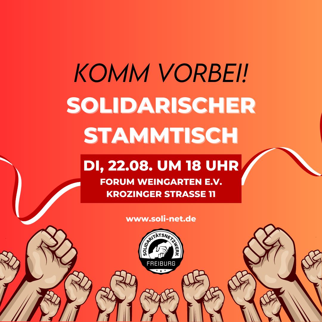 Unser Solidarischer Stammtisch im August findet ausnahmsweise nicht am Montag, sondern am Dienstag, den 22.08 ab 18 Uhr im Stadtteilbüro Forum Weingarten, Krozinger Straße 11 statt. Wenn ihr euch mit uns in solidarischer Athmosphäre über das Leben im Kapitalismus und darüber wie wir uns gegen Unterdrückung und Ausbeutung wehren können austauschen wollt, dann schaut gerne vorbei!