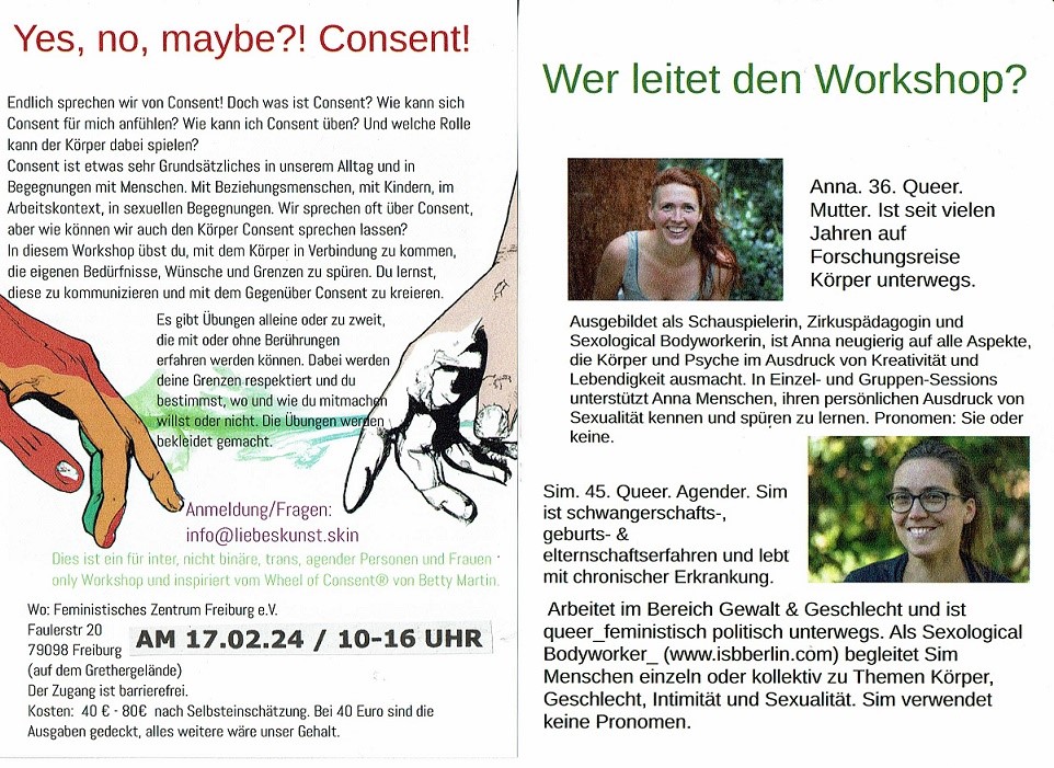 Consent ist etwas sehr Grundsätzliches in unserem Alltag und in Begegnungen mit Menschen. Mit Beziehungsmenschen, mit Kindern, im Arbeitskontext, in sexuellen Begegnungen. Wir sprechen oft über Consent, aber wie können wir auch den Körper Consent sprechen lassen?