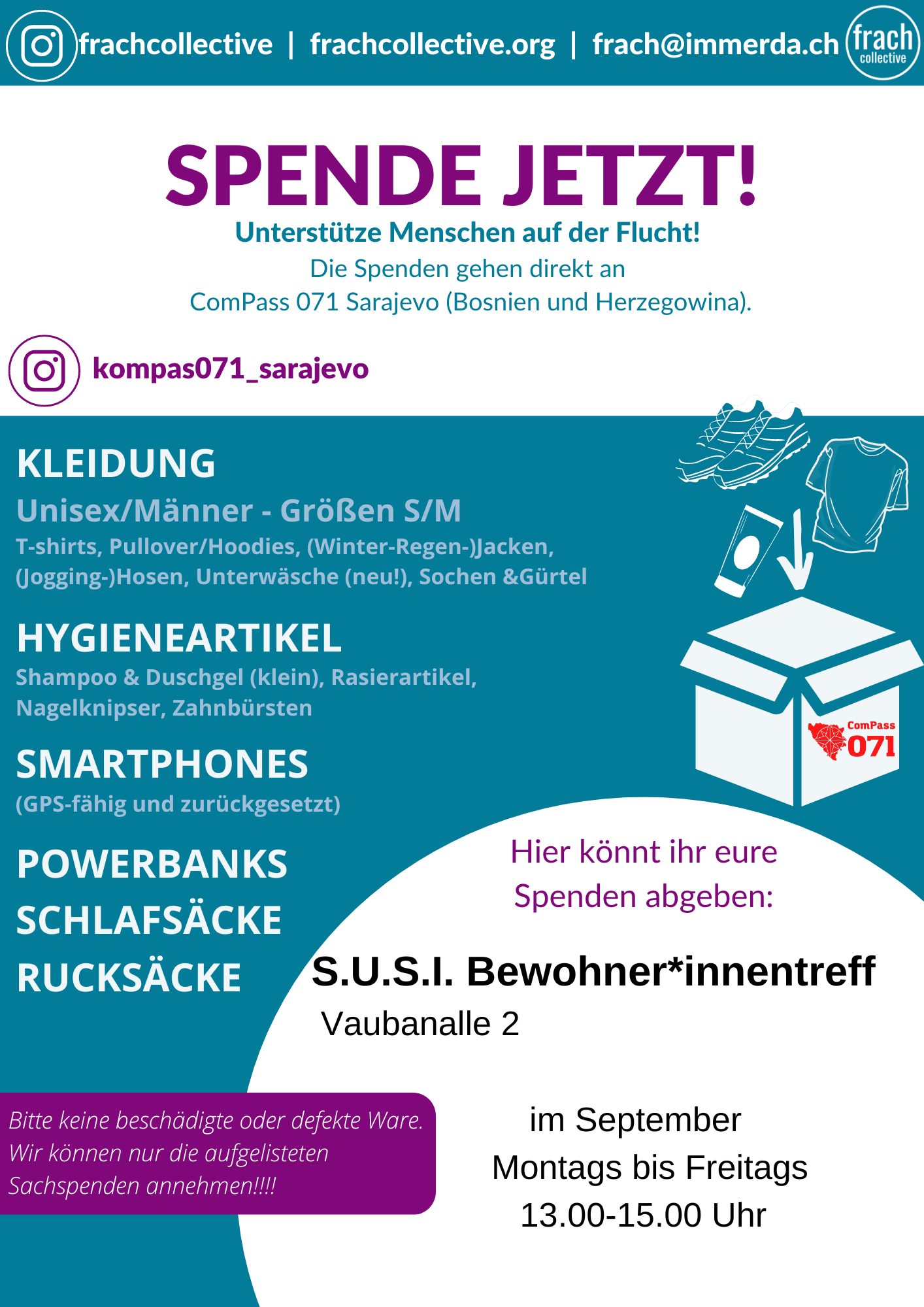Wir sammeln diesen September in mehreren Städten in Deutschland und der Schweiz Spenden für People on the Move in Bosnien & Herzegowina (Kompas 071 Sarajevo).