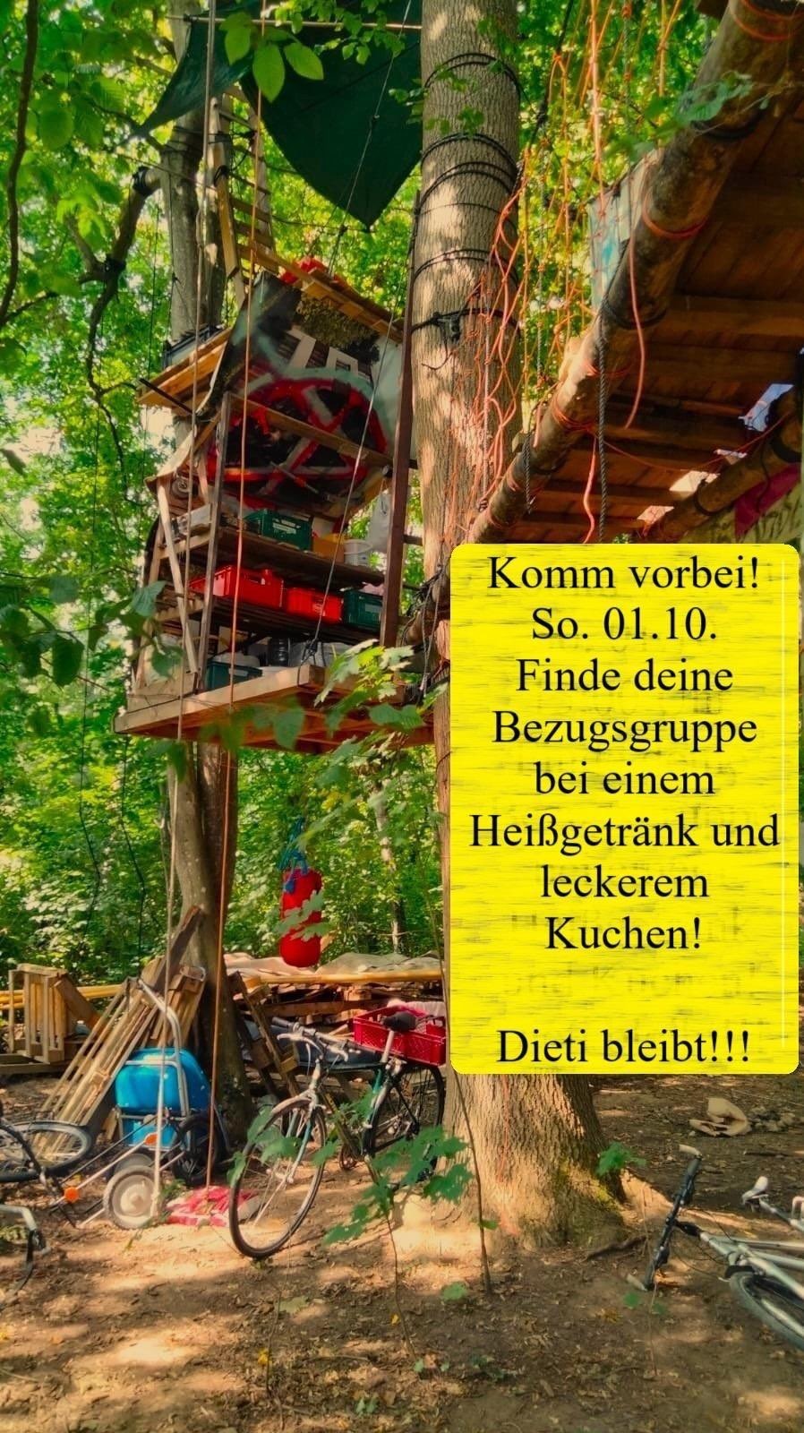 Wir laden euch alle ein, jeden einzelnen Menschen von euch (!), zum Dietenbachwald zu kommen. Um 15 Uhr treffen wir uns, um gemeinsam bei Kaffee und Kuchen unsere Bezugsgruppe zu finden.