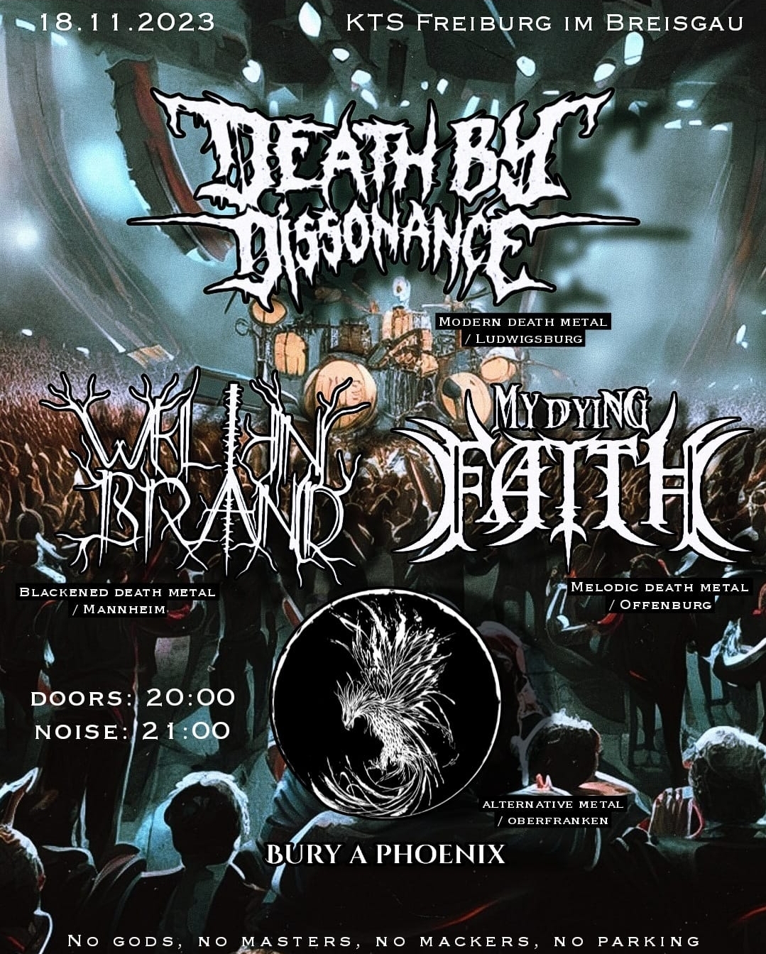 Am 18.11.2023 gibt es nach langer Zeit in Freiburg Mal wieder ein paar Death Metal Bands! Wir begrüßen DEATH BY DISSONANCE (Modern Death Metal, Ludwigsburg), WELTENBRAND (Blackened Death Metal, Mannheim), MY DYING FAITH (Melodic Death Metal, Offenburg) und BURY A PHOENIX (Alternative Metal, Oberfranken) bei uns in der KTS!