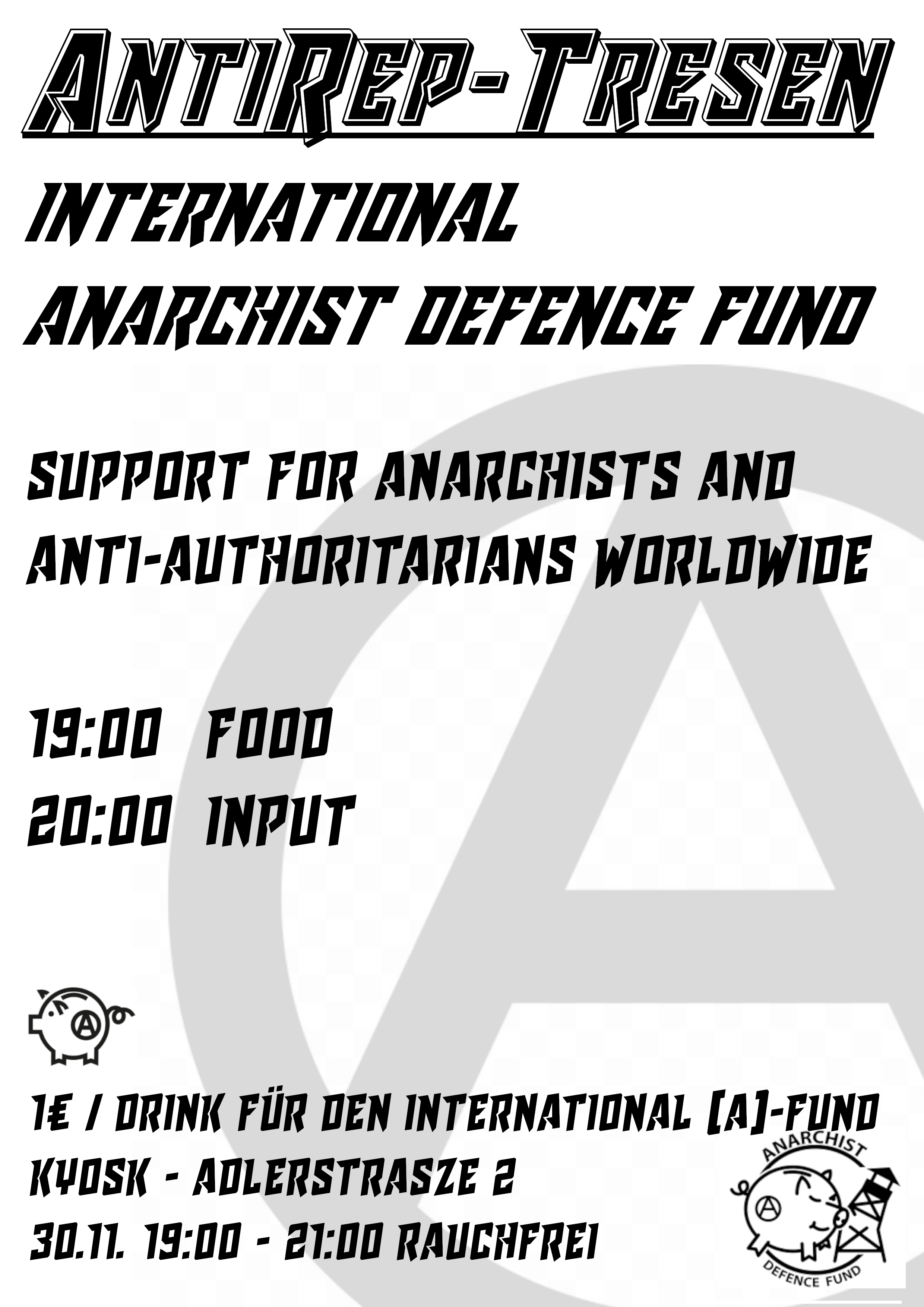 Seit 2018 unterstützt der International Anarchist Defence Fund weltweit Anarchist*innen und Antiautoritäre in ihrem struggle gegen Repression und anderen Schwierigkeiten, die sie auf Grund ihrer Einstellung und Handlung erfahren. Um diese Kämpfe sichtbar zu machen und dem Wort Solidarität etwas Inhalt zu geben, laden wir euch ein, eure übrigen Taler abzugeben, bevor sie etwa für Weihnachtsgeschenke oder anderen Kram ausgegeben werden.