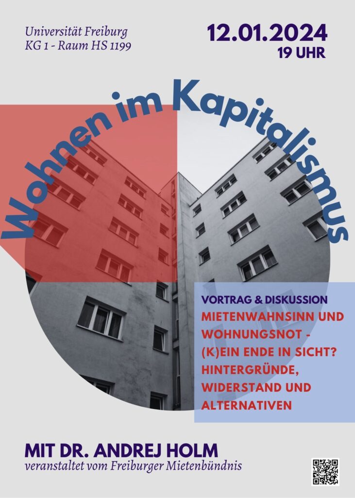 Freiburg leidet unter der Kluft zwischen den zu niedrigen Einkommen auf der einen und den horrenden Mieten und Immobilienpreisen auf der anderen Seite. Bezahlbare Wohnungen für Menschen mit durchschnittlichen Einkommen sind nicht mehr zu finden. … Was sind die Ursachen und Hintergründe dieser Wohnungsnot und des Mietenwahnsinns? Was tun? Welche Erfahrungen gibt es aus Widerstands- und Protestbewegungen?