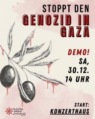 Inmitten globaler Feierlichkeiten steht Gaza vor einer Realität von Bombardierungen, Massakern und Hungersnöten. Fast zwei Millionen Menschen wurden vertrieben und müssen Zuflucht in kalten Zelten suchen. Der unerbittliche Völkermord durch Israel zeigt keine Anzeichen eines Endes. Es ist entscheidend, weiter zu demonstrieren, auf den Straßen in Solidarität und Widerstand gegen die Narrative zu stehen, die der deutsche Staat über Palästina und die Palästinenser konstruiert. Jedes Leben, dass heute in Gaza verloren wurde, hätte gestern durch einen Waffenstillstand gerettet werden können. Schließt euch unserer Forderung nach einem Waffenstillstand an. Schließt euch unserer Forderung nach Befreiung an.