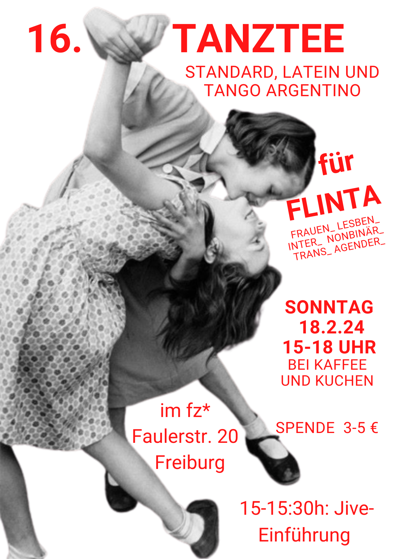 Sonntag, 18.02.24 um 15:00 Uhr - 18:00 Feministisches Zentrum Grethergelände 20 79098 Freiburg im Breisgau Deutschland Show map barrierearm Wir tanzen Standard, Latein und Tango Argentino bei Kaffee und Kuchen Von 15:00-15:30 gibt es eine Einführung in den Jive Spende für Eintritt von 3-5 Euro erwünscht Type of Event Sport Kultur Workshop