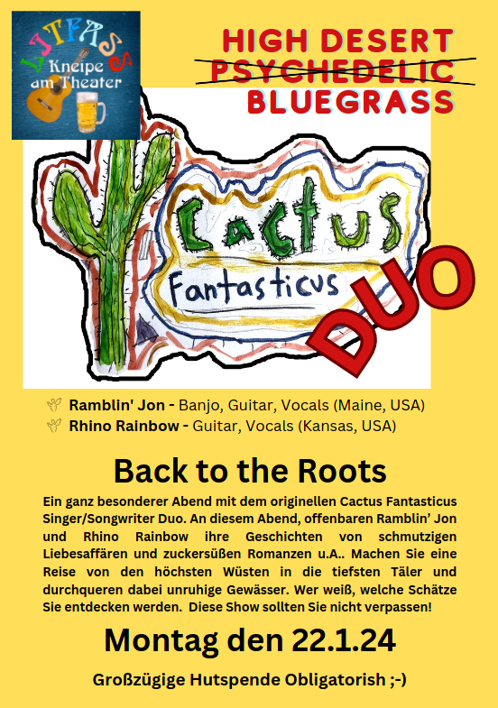 Ein ganz besonderer Abend mit dem originellen Cactus Fantasticus Singer/Songwriter Duo. An diesem Abend, offenbaren Ramblin’ Jon und Rhino Rainbow ihre Geschichten von schmutzigen Liebesaffären und zuckersüßen Romanzen u.A.. Machen Sie eine Reise von den höchsten Wüsten in die tiefsten Täler und durchqueren dabei unruhige Gewässer. Wer weiß, welche Schätze Sie entdecken werden. Diese Show sollten Sie nicht verpassen!