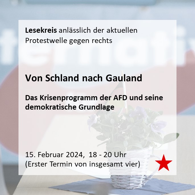 Anlässlich der aktuellen Protestwelle gegen rechts laden wir zu einem kleinen Lesekreis zur Broschüre „Von Schland nach Gauland - Das Krisenprogramm der AFD und seine demokratische Grundlage“ ein.