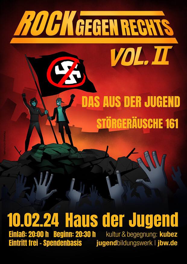 Die Neuauflage von „Rock gegen Rechts“ bietet am Samstag, 10. Februar (Einlass 20.00 Uhr / Beginn 20.30 Uhr) mit „Störgeräusche 161“ und „Das Aus der Jugend“ zwei knackige Bands aus der Szene sowie jede Menge Infostände diverser jugendpolitischer Gruppierungen. Musik, Infos und Austausch: Gemeinsam geht es darum Zeichen zu setzen und Stellung zu nehmen gegen rechte Politik und Positionen im Aufwind! Der Eintritt ist frei – Spenden gehen an die Rote Hilfe Freiburg.