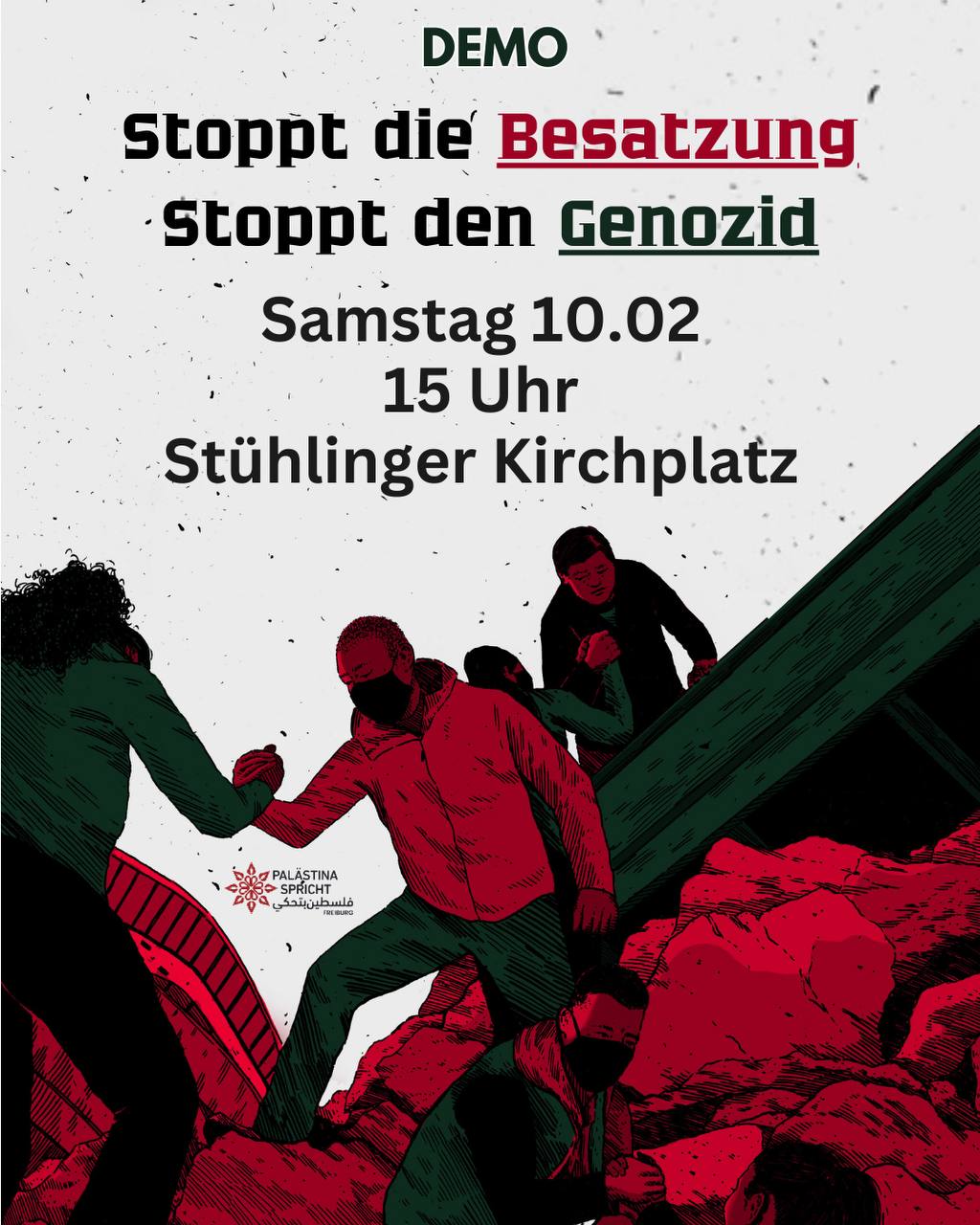 “Stoppt die Besatzung, stoppt den Genozid” lautet die Forderung, die wir am Samstag, den 10.02. an die Öffentlichkeit tragen wollen. Um 15 Uhr treffen wir uns am Stühlinger Kirchplatz, um von dort den Aufzug durch die Innenstadt zu beginnen.