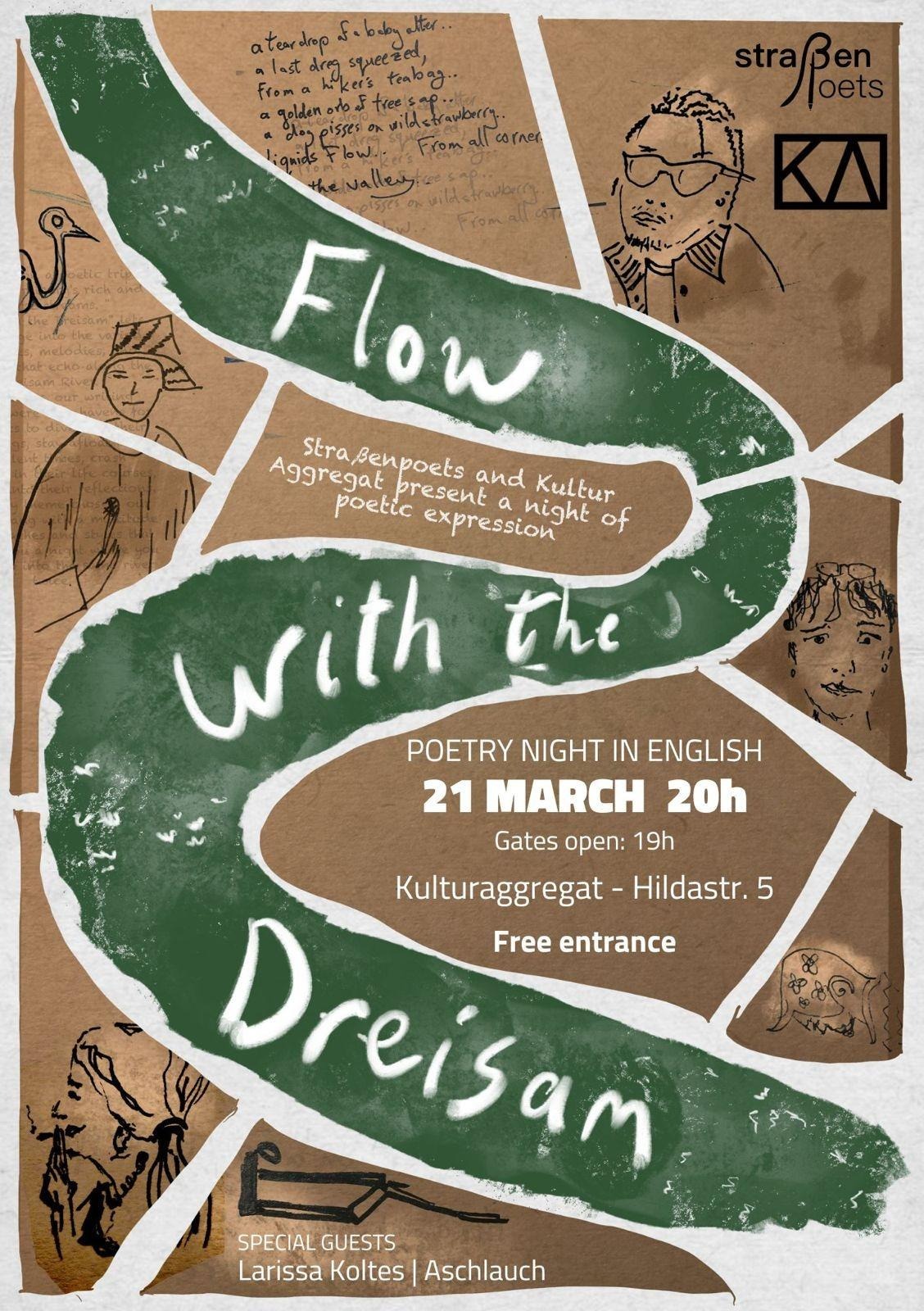 Flow with the Dreisam lets you plunge into the varied narratives, melodies, and emotions that echo along the Dreisam River. For months, our writing sessions were safe havens for our poets to dive into their feelings, stay afloat in turbulent times, crash furiously in their life courses, or stare into their reflections. For every theme chosen, our group sprang with a multitude of approaches and styles that promise you a night where you won't step into the same river twice.