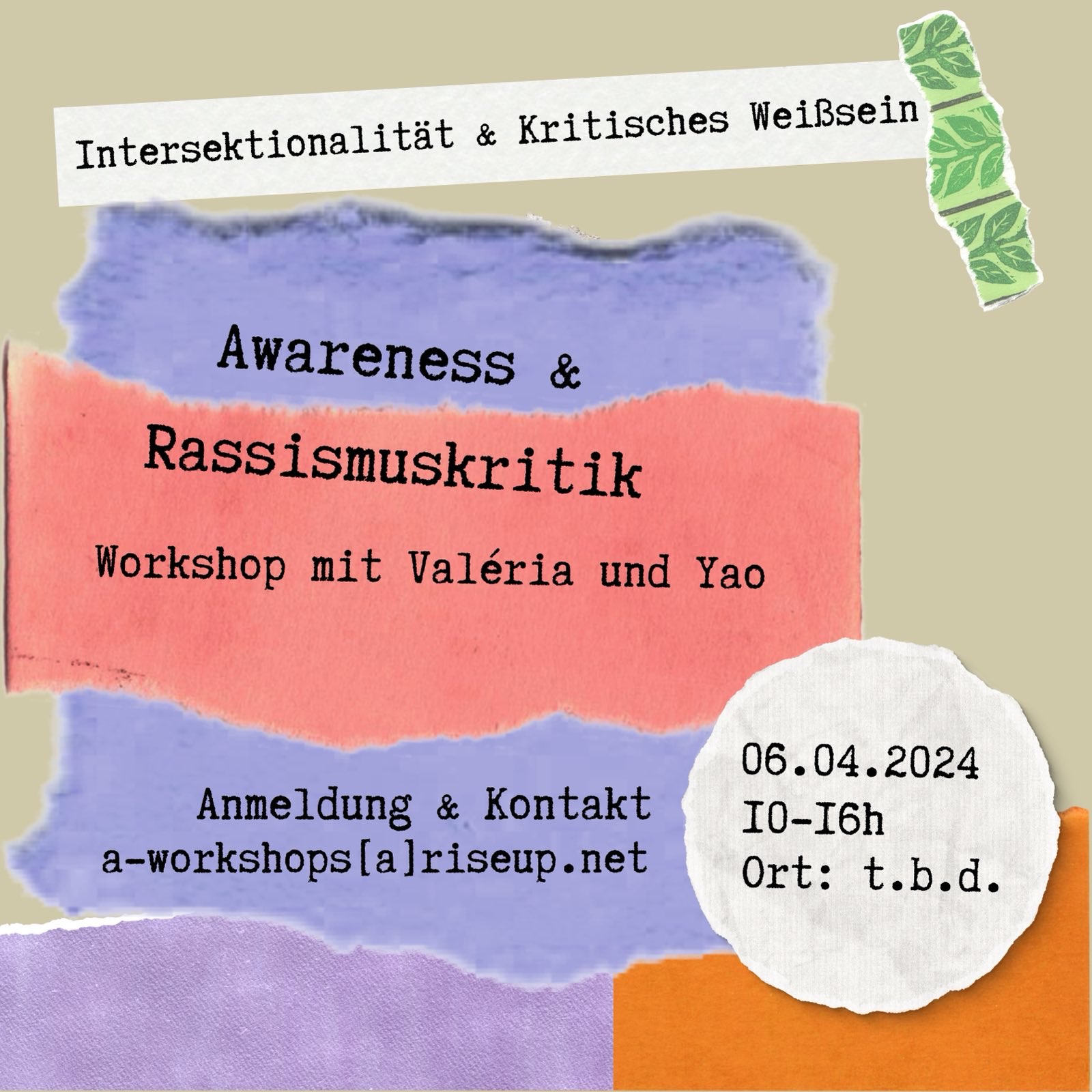 Wie können wir Awareness-Arbeit rassismuskritisch umsetzen? Wie können wir in der Unterstützungsarbeit von Betroffenen intersektional handeln und uns für rassistische Diskriminierungsformen sensibilisieren? Wie gestalten wir gemeinsam einen rassismuskritischen Raum? Wie betreiben wir Prävention und aktives Reagieren, ohne rassistische Muster zu reproduzieren? Im diesem Workshop möchten wir mit der Thematisierung des kritischen Weißseins und der Intersektionalität rassistische Machtgefälle und Ungleichheiten in der Awareness-Arbeit erkennen und diesen entgegenwirken.