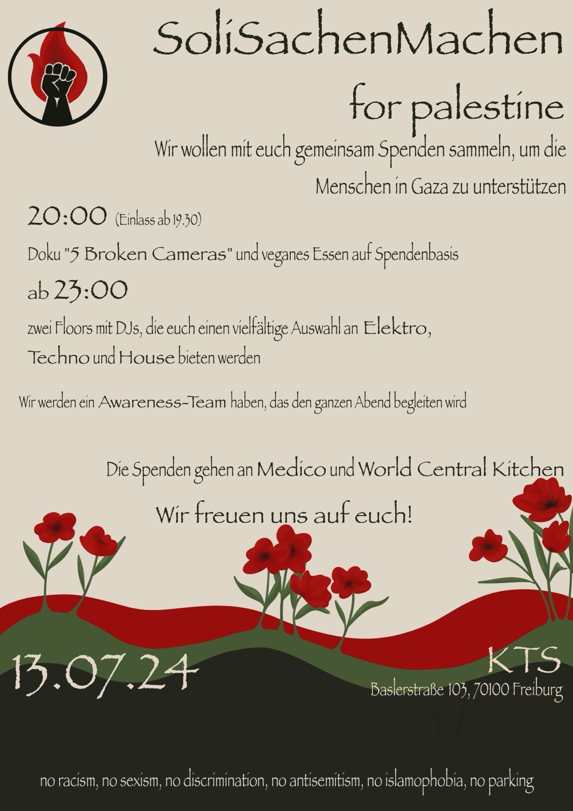 Angesichts der anhaltenden humanitären Katastrophe in Gaza/Palästina organisieren wir eine weitere Soli-Party, um diejenigen zu unterstützen, die an den Folgen der Bombardierungen und der Hungersnot in Gaza leiden.