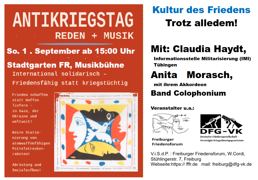 Das Freiburger Friedensforum ,die DFG-VK Freiburg und andere Gruppierungen laden in diesem Jahr zum Antikriegstag am Sonntag, den 1.9.2024 ab 15h zu einer Veranstaltung in den Stadtgarten Freiburg bei der Musikbühne ein.
