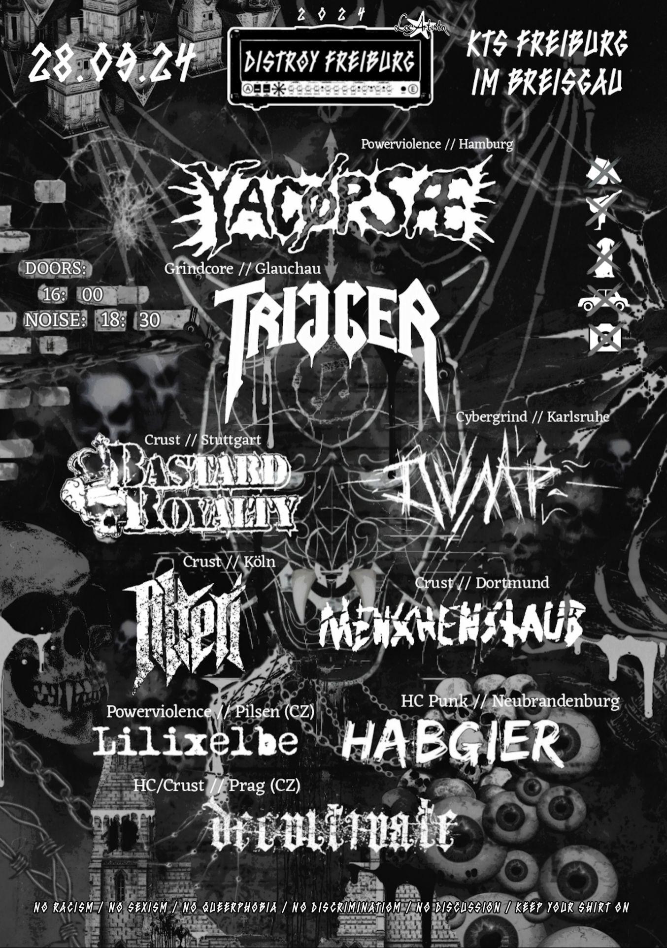 Das DISTROY Freiburg Festival geht in die dritte Runde! Am 28.09.24 öffnen wir für euch um 16:00 die Türen, um 18:30 beginnt die erste Band. Dieses Jahr bringen ganze 9 Bands für euch die Bühne zum Beben: