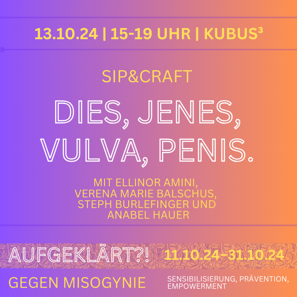 Dies, Jenes, Vulva, Penis – Aufgeklärt?! lädt zum Künstlerisch und Kreativ sein ein. Am Sonntag, 13.10.24 zwischen 15 und 19 Uhr habt ihr bei Drinks und Snacks die Möglichkeit zu craften, euch auszutauschen, über den Tellerrand zu schauen und dem Aufgeklärt?!-Team anonym eure Fragen rund ums Genital zu stellen. Beim offenen Angebot könnt ihr alleine oder gemeinsam, ganz frei oder mit Anleitung, vier Stunden am Stück oder für eine halbe Stunde, malen, zeichnen, drucken, falten und formen.
