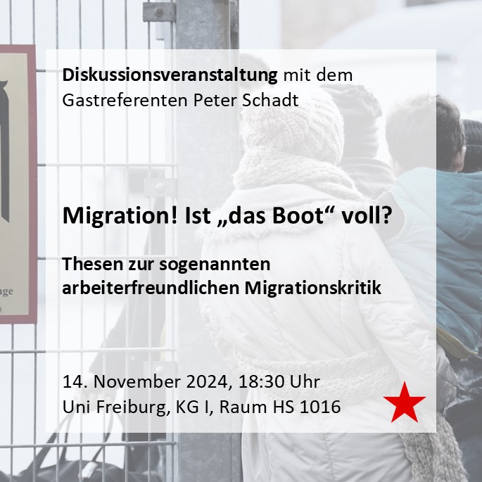 Im Rahmen der Kritischen Einführungstage (KrEta) laden wir am 14. November um 18:30 Uhr an der Uni Freiburg im KG I Raum HS 1016 zu einem Vortrag mit anschließender Diskussion mit dem Gastreferenten Peter Schadt ein. Thema des abends ist die sogenannte arbeiterfreundliche Migrationskritik.