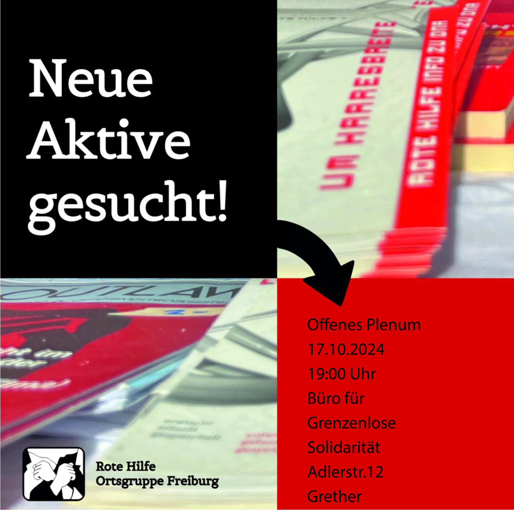 Wenn ihr Lust habt mehr zu erfahren zur Roten Hilfe Freiburg und welche Fälle wir aktuell begleiten oder wenn ihr auch mitmachen wollt, kommt gerne zu unserem