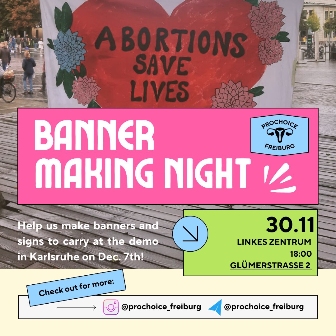 Wir werden Banner und Schilder gestalten und bemalen, die wir bei der regionalen Demonstration (Karlsruhe, 7.12.) mitnehmen, um für die Abschaffung von Paragraph 218 zu kämpfen, der in Deutschland immer noch Abtreibungen kriminalisiert.