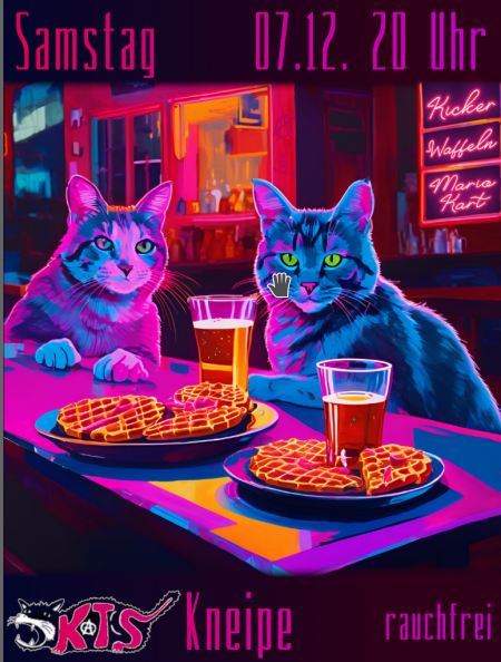 Samstag, 07.12.24 um 20:00 Uhr KTS - Kulturtreff in Selbstverwaltung (KaTS) Basler Straße 103 79100 Freiburg im Breisgau Deutschland Show map Es ist mal wieder Zeit für eine gemütliche Kneipe in der Kats! Es gibt Waffeln, eine Mario Kart Ecke und leckere Getränke. rauchfrei. Kommt rum! Kneipe mit lecker Waffeln Organization KaTS