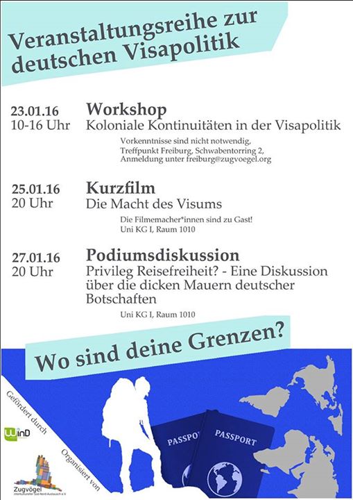 Mit einer Veranstaltungsreihe zum Thema "Deutsche Visavergabe und -politik" möchten wir Grenzen aus ihrer Unsichtbarkeit herausholen und Menschen mit deutschen und europäischen Pässen über ausgrenzende Mechanismen der Visavergabe informieren und sensibilisieren.