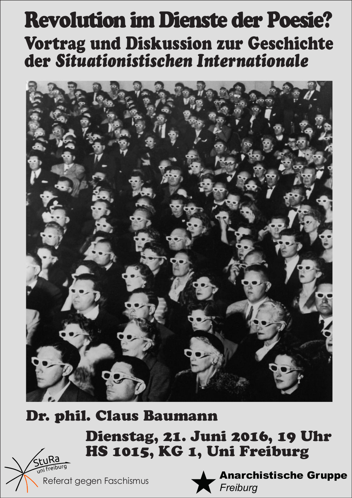 Anhand eines einführenden Vortrags zur Geschichte der Situationistischen Internationale werden diese Problembereiche von Claus Baumann in Vorbereitung auf eine gemeinsame Diskussion beleuchtet.