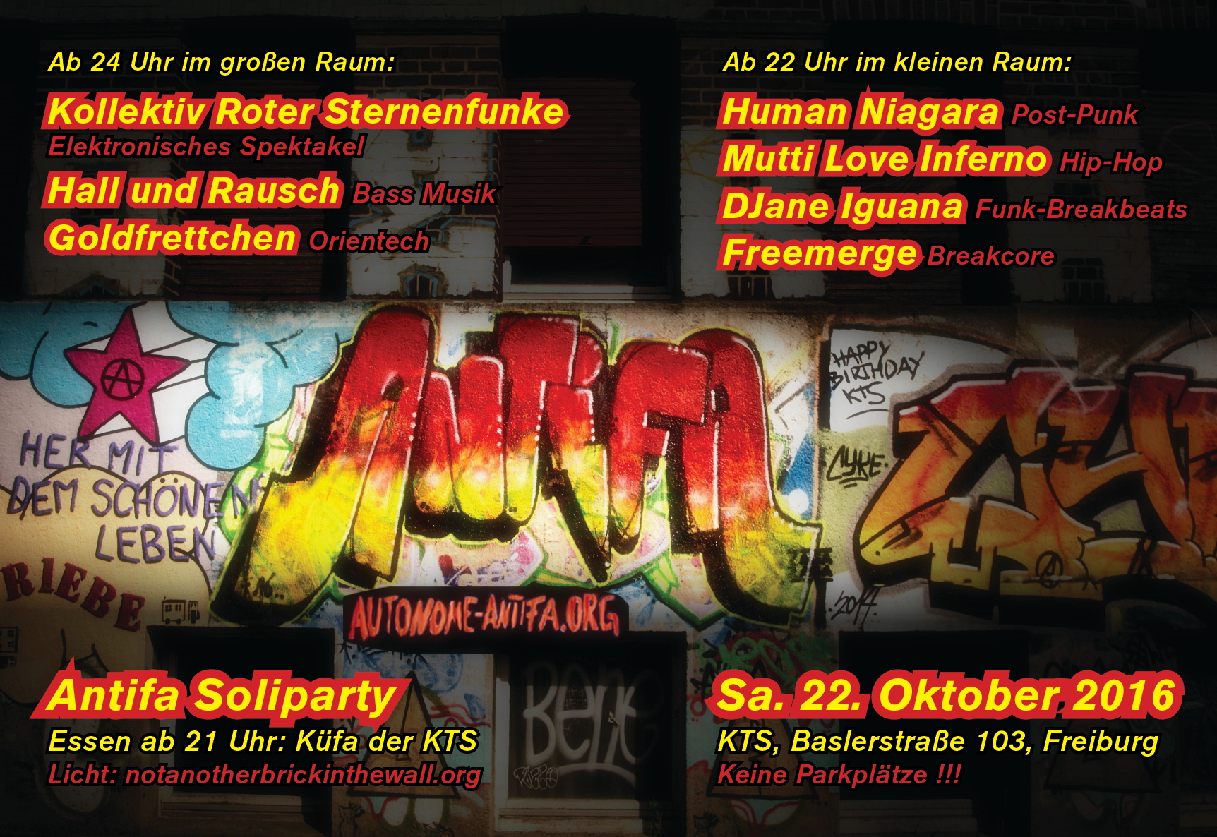 Es ist soweit, das Jahr beugt sich Richtung Mütze tragen und der See ist nicht mehr das 2. Zuhause. Die „ich geh mal rein“-Saison beginnt, gleichzeitig auch das verlangen nach elektronischer Musik. Wie gerufen kommt die 10. Soliparty der Autonomen Antifa am 22. Oktober in der KTS Freiburg. Hier wird mal wieder alles kombiniert: essen, trinken, rauchen, Musik hören und Politik finanzieren!