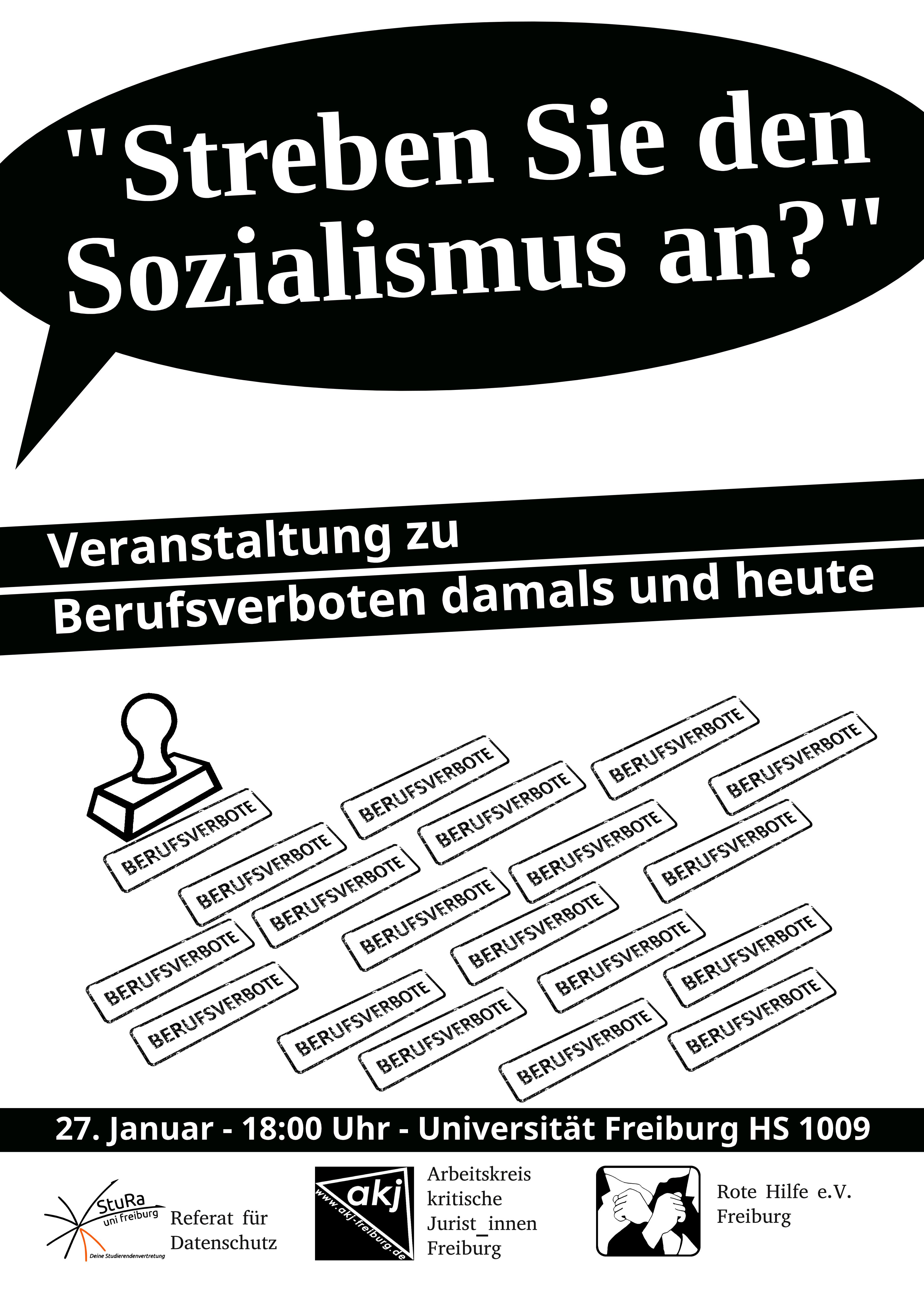 Gemeinsam wollen wir uns damit beschäftigen, welchen Zweck Berufsverbote haben, wie versucht wird sie durchzusetzen und wie ein solidarischer Umgang damit aussehen kann.