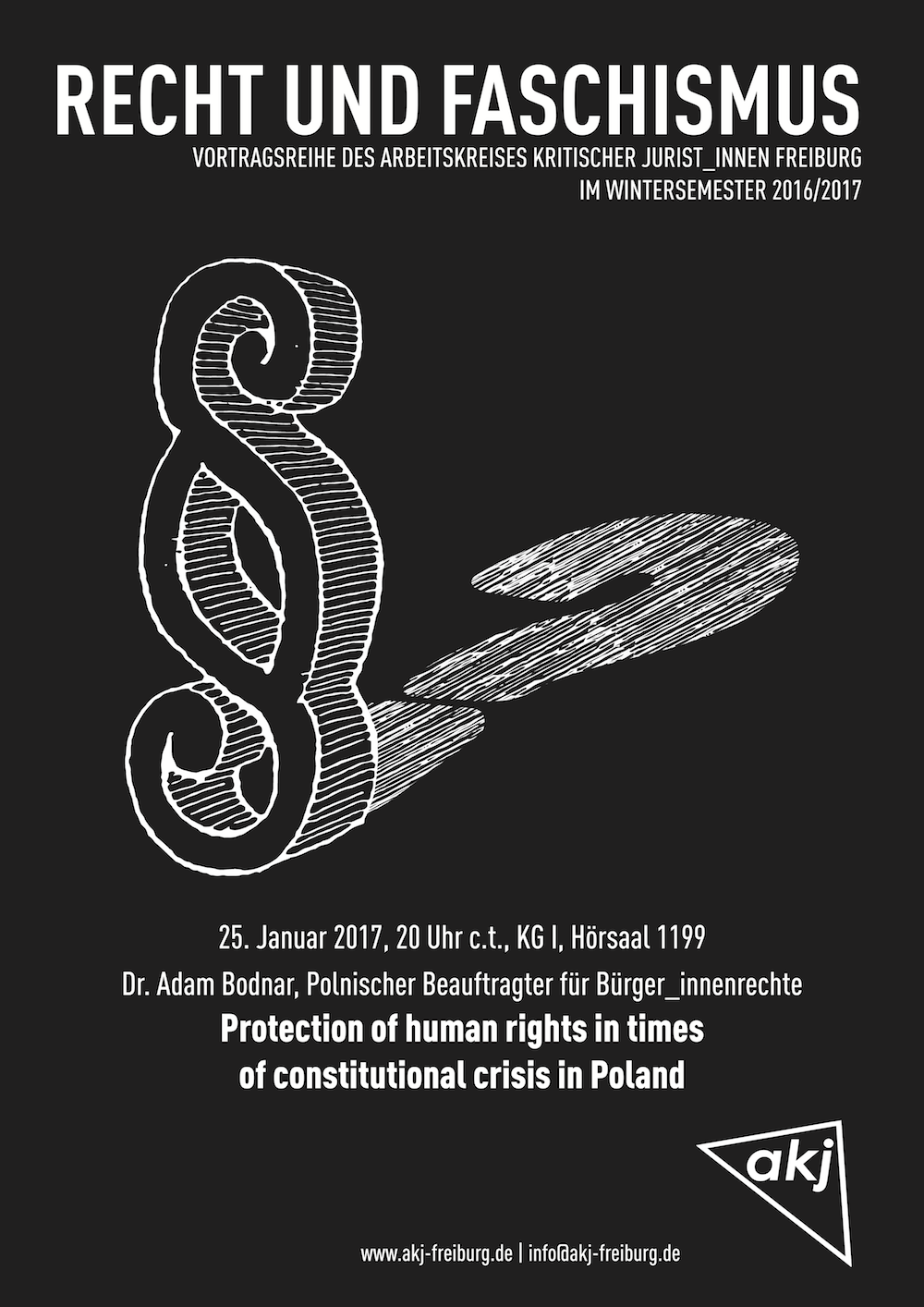 Im Rahmen der Vortragsreihe des Arbeitskreises der kritischen Jurist_Innen Freiburg im Wintersemester 2016/2017 „Recht und Faschismus“ hält am 25. Januar um 20 Uhr c.t. in Hörsaal 1199 (Kollegiengebäude I) Dr. Adam Bodnar, Polnischer Beauftragter für Bürger_innenrechte, einen Vortrag zum Thema "Protection of human rights in times of constitutional crisis in Poland"