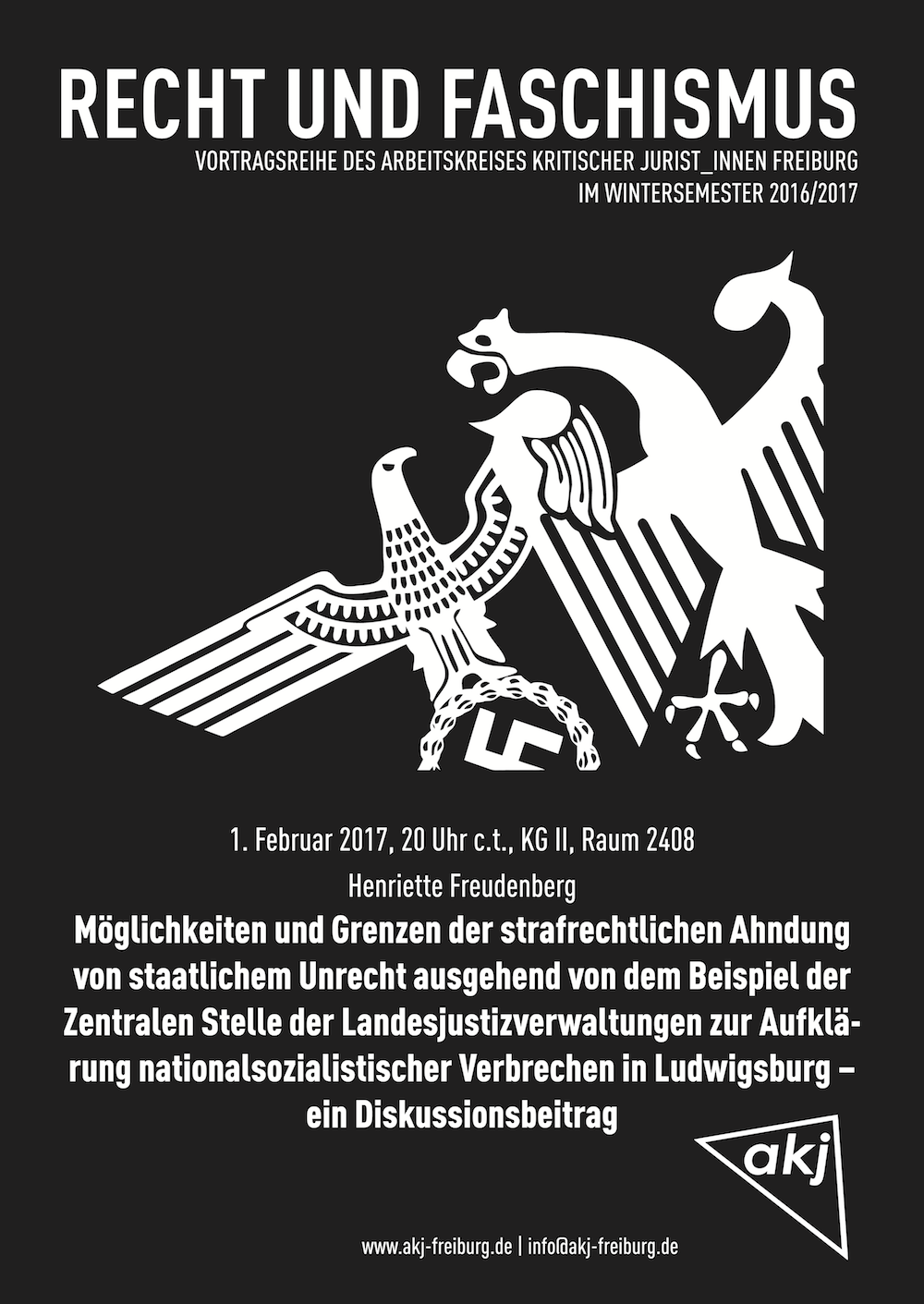 Im Rahmen der Vortragsreihe des Arbeitskreises kritischer Jurist_Innen Freiburg im Wintersemester 2016/2017 „Recht und Faschismus“ gibt Henriette Freudenberg einen Diskussionsbeitrag zum Thema: