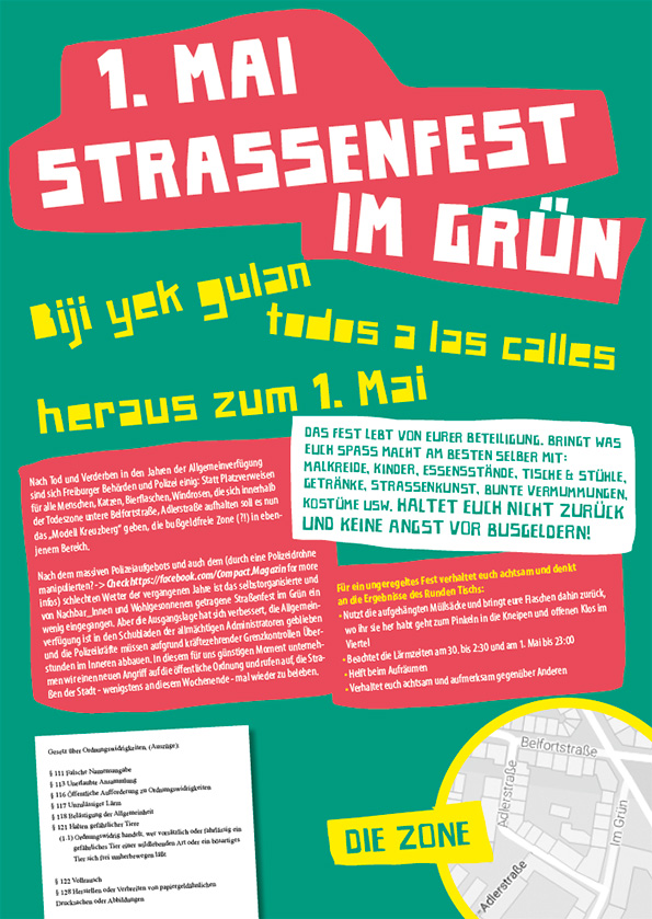 Nach dem massiven Polizeiaufgebots und auch dem (durch eine Polizeidrohne manipulierten? -> Check https://facebook.com/Compact.Magazin for more infos) schlechten Wetter der vergangenen Jahre ist das selbstorganisierte und von Nachbar_Innen und Wohlgesonnenen getragene Straßenfest im Grün ein wenig eingegangen. Aber die Ausgangslage hat sich verbessert, die Allgemeinverfügung ist in den Schubladen der allmächtigen Administratoren geblieben und die Polizeikräfte müssen aufgrund kräftezehrender Grenzkontrollen Überstunden im Inneren abbauen. In diesem für uns günstigen Moment unternehmen wir einen neuen Angriff auf die öffentliche Ordnung und rufen auf, die Straßen der Stadt - wenigstens an diesem Wochenende - mal wieder zu beleben.