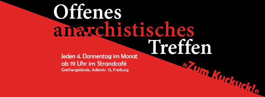 “Zum Kuckuck!” – das offene anarchistische Treffen für Freiburg und Region – soll einen Anlaufpunkt für Menschen bieten, die sich für anarchistische Politik interessieren oder sich selbst bereits als Anarchist*innen begreifen und sich organisieren wollen. Auf den regelmäßigen Treffen wollen wir uns zusammen die Frage stellen, was wir uns von einem anarchistischen Austausch erhoffen, welche gemeinsamen Ziele wir teilen und welche Konflikte und soziale Kämpfe derzeit von besonderem Interesse sind. Für am Anarchismus Interessierte empfehlen wir die Lektüre der kurzen Broschüre “Anarchismus – Eine Einleitung”, um sich einen ersten Überblick zu verschaffen. Wir freuen uns auf euer Kommen!