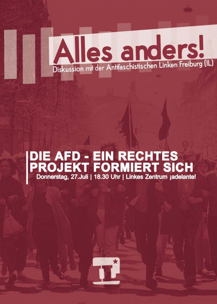 »Alles anders« ist ein offener Gesprächsabend mit der Antifaschistischen Linken Freiburg (IL). In entspannter Atmosphäre wollen wir uns über aktuelle politische Themen, Strategien und Handlungsalternativen austauschen. Dabei steht jeder Abend unter einem thematischen Schwerpunkt – vom Aufstieg der AfD über Klimakämpfe bis hin zur Frage, warum wir noch immer im Kapitalismus leben. Egal, ob ihr nur reinschnuppern, einen geselligen Abend verbringen oder mitdiskutieren wollt – jede_r ist herzlich willkommen. Wir freuen uns auf euch!