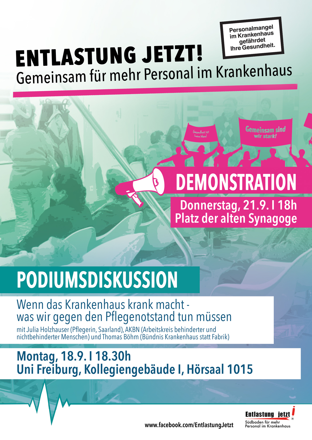 Wir beleuchten aus verschiedenen Perspektiven das Ausmaß, in dem das Pflegepersonal in den Kliniken überlastet ist, die Auswirkungen auf Pfleger_innen und Patient_innen sowie die Ursachen dieser Situation. Politisch herbeigeführter Kostendruck durch die Finanzierung über Fallpauschalen und die Übertragung von Krankenhäusern an private Unternehmen führen zu immer wachsenden Belastungen. Doch es regt sich Widerstand, in den Kliniken selbst, aber auch in zivilgesellschaftliche Bündnissen treten Menschen für tarifliche und gesetzliche Sicherung einer Mindestbesetzung auf den Stationen ein. Über den Stand dieser Aktionen und darüber, was wir tun können, wollen wir miteinander diskutieren.