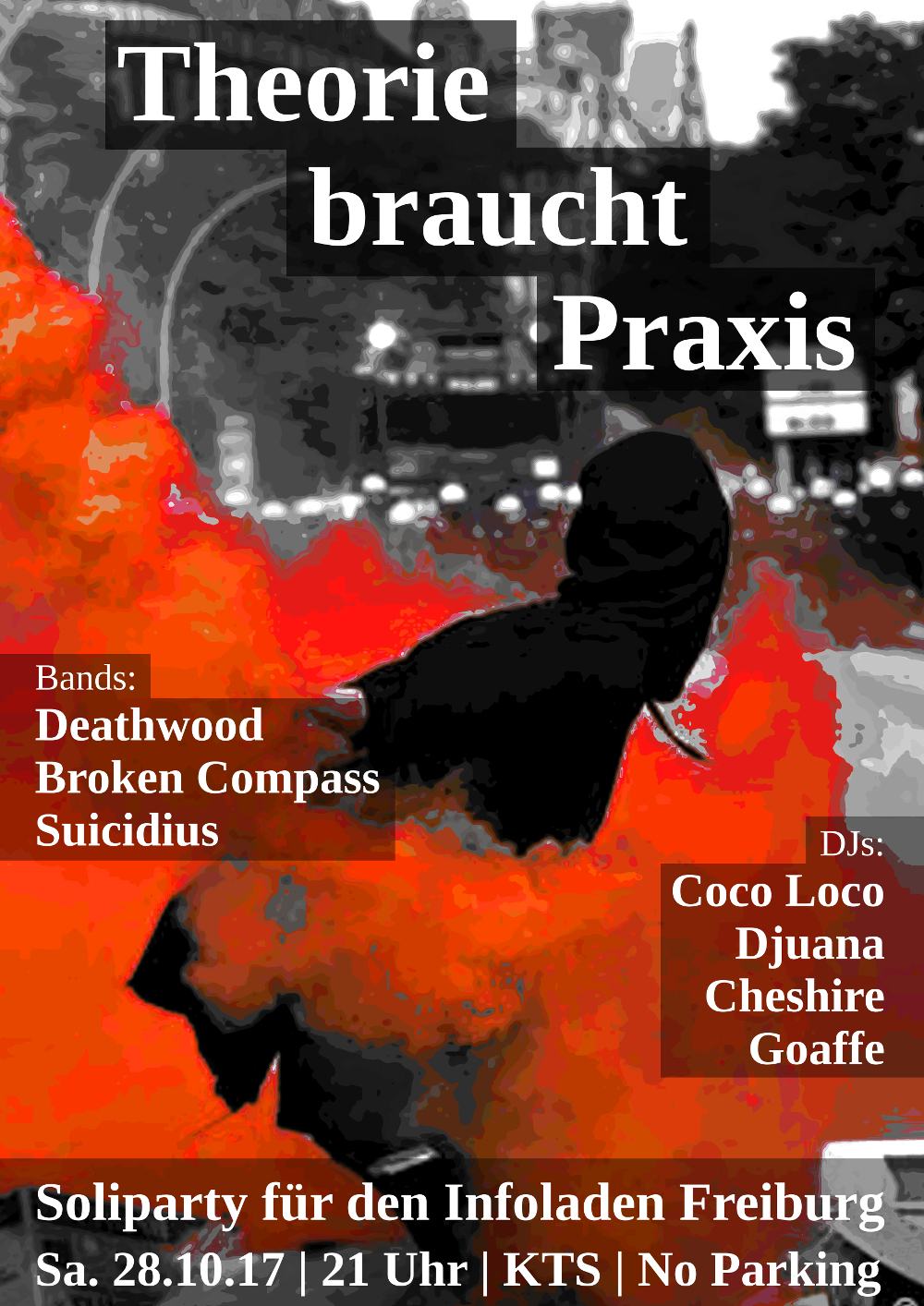 Der Abend beginnt mit den Bands um dann in der Nacht auf tanzbare Klänge in schönen Sets arrangiert überzugehen. Alle Spenden des Abends dienen dazu das Angebot des Infoladens zu verbessern und die weiterführung unseres Bildungsprogramms (Lesungen, Workshops, Vorträge sowie eine geplante Buchmesse/Kongress Ende April) zu ermöglichen.